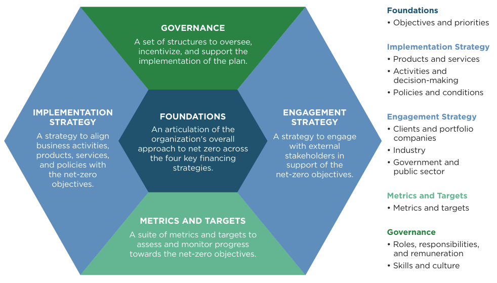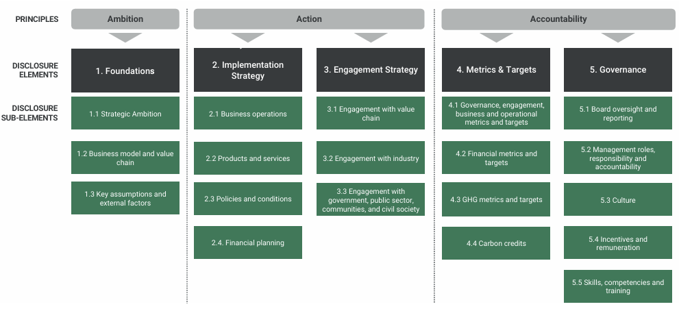 Taken together, these components are designed to support financial institutions to develop a credible transition plan that is “actionable, measurable, with long-term targets but focused on near-term action, based on climate science, and against which there is accountability and transparency on underlying strategy and progress”.